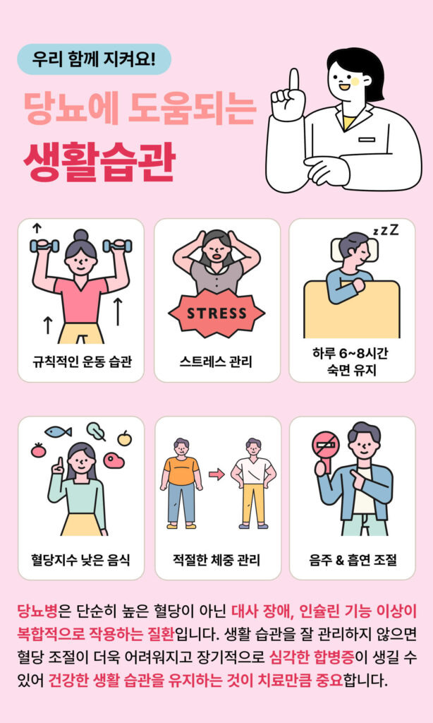 당뇨병 수치는 약만으로 관리되는 숫자가 아닙니다. 오히려 매일의 생활습관이 가장 큰 영향을 미칩니다. 규칙적인 수면, 가벼운 유산소 운동, 스트레스 관리만으로도 공복 혈당 수치는 눈에 띄게 달라질 수 있습니다.